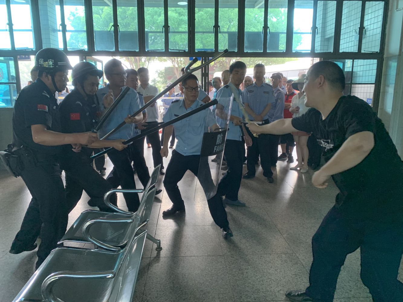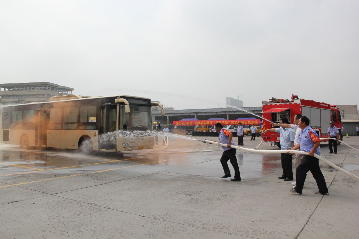 為深刻貫徹第十八個(gè)全國安全生產(chǎn)月“防風(fēng)險(xiǎn)、除隱患、遏事故”活動主題,進(jìn)一步加強(qiáng)公司消防、反恐管理工作及公安機(jī)關(guān)“135”快速反應(yīng)圈處置配合能力,6月27日,蕭山公交在通惠路公交站舉行反恐、消防突發(fā)事件“四聯(lián)三防”應(yīng)急處置演練,區(qū)反恐大隊(duì)、區(qū)交通治安派出所領(lǐng)導(dǎo)及公司班子成員、各部門負(fù)責(zé)人、各巡防隊(duì)伍、義務(wù)消防隊(duì)伍等200余人觀摩了此次演練。