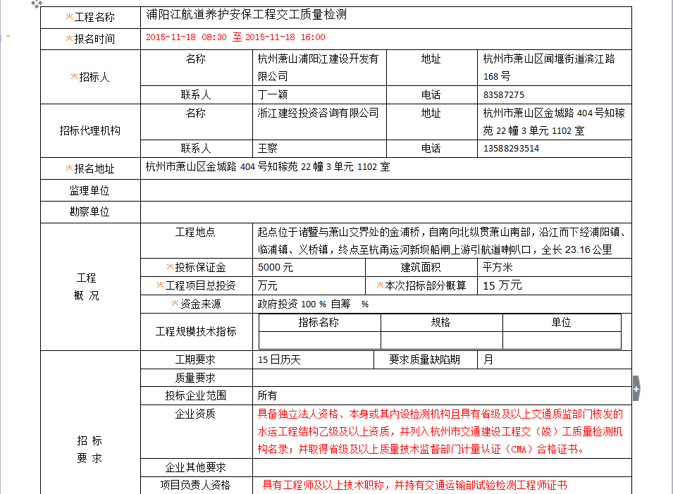 浦陽江航道養護安保工程交工質量檢測招標公告