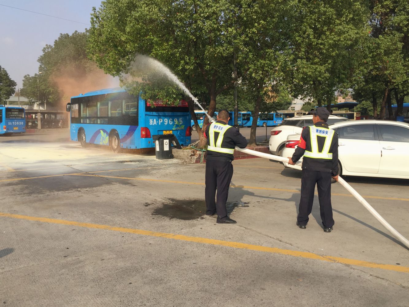 上午9時,演練正式開始,一枚煙幕彈在公交車底部燃燒,該公交車開始冒煙,9時25秒,一名保安在巡查時發現突發情況,立即使用4KG手提式干粉滅火器進行撲救,隨后進行上報并報警,9時30秒時,場站監控室發現 “火情”,拉響警報,9時1分10秒通惠路站一車隊、二車隊、五車隊及物業消防應急隊伍趕到現場,用4KG手提式干粉滅火器進行撲救,場站司機迅速疏散 “起火”公交車周邊車輛,9時1分45秒第一輛車被安全疏散,9時2分25秒義務消防隊員啟用消防栓,9時2分35秒消防水帶出水,9時3分45秒火勢撲滅,警報解除。