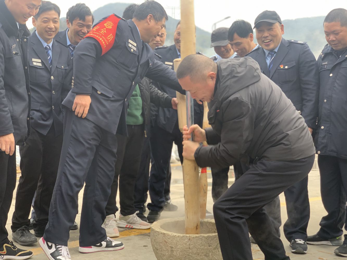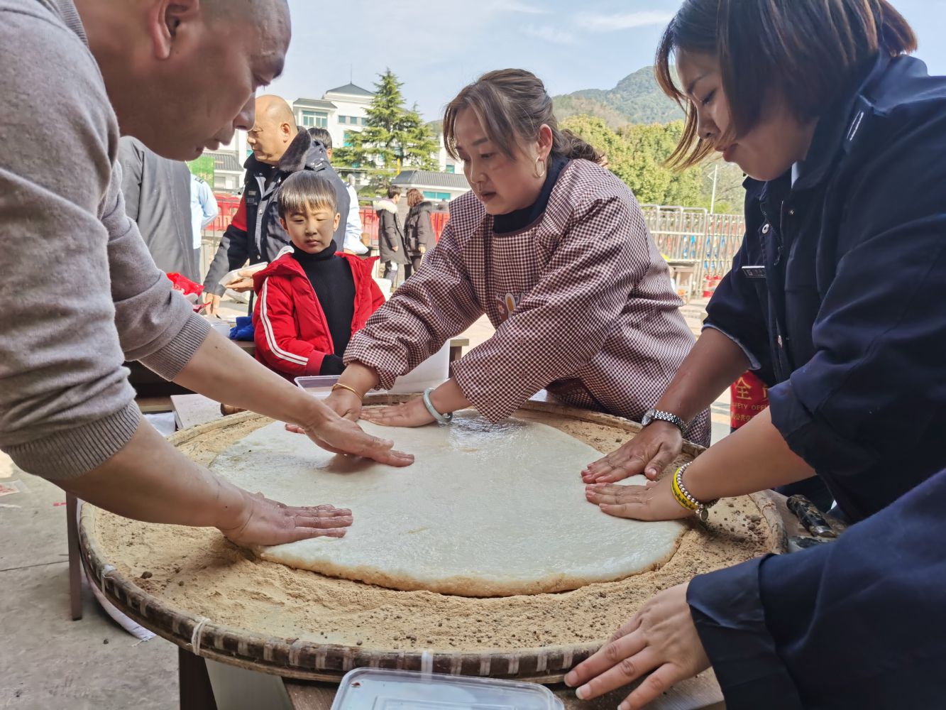 活動現場,大家有說有笑,分工合作,用木蒸籠將糯米蒸好倒入石臼,經過反復碾捶后,再將其鋪開剪成一片片小塊,裹上芝麻或紅糖。咬上一口,軟綿綿滑溜溜,糯米的醇和著白糖的甜、艾青的香,帶來一種久違的熟悉的傳統記憶;附近的村民吃的滿口留香,紛紛稱贊說:這才是年的味道!