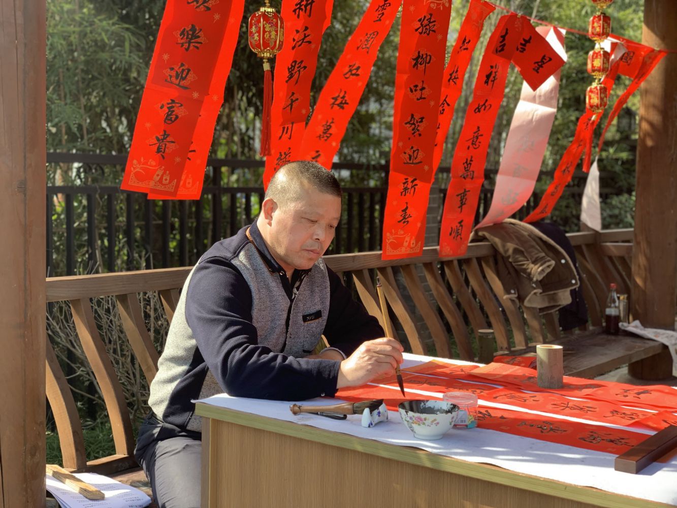 “總把新桃換舊符”,大紅的春聯福字,寓意著吉祥喜慶,手寫春聯,則讓年味更加正宗。品嘗過美味的年食后,公交書法愛好者現場提筆、揮墨潑毫,以蒼勁有力的筆法為大家送上了“墨香四溢”的新年祝福,一幅幅滿載美好寓意的春聯和福字被村民、乘客搶著“惠存”。