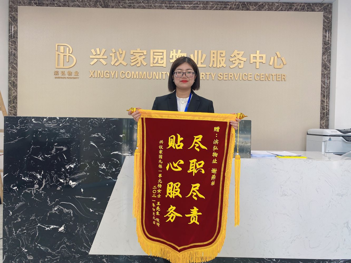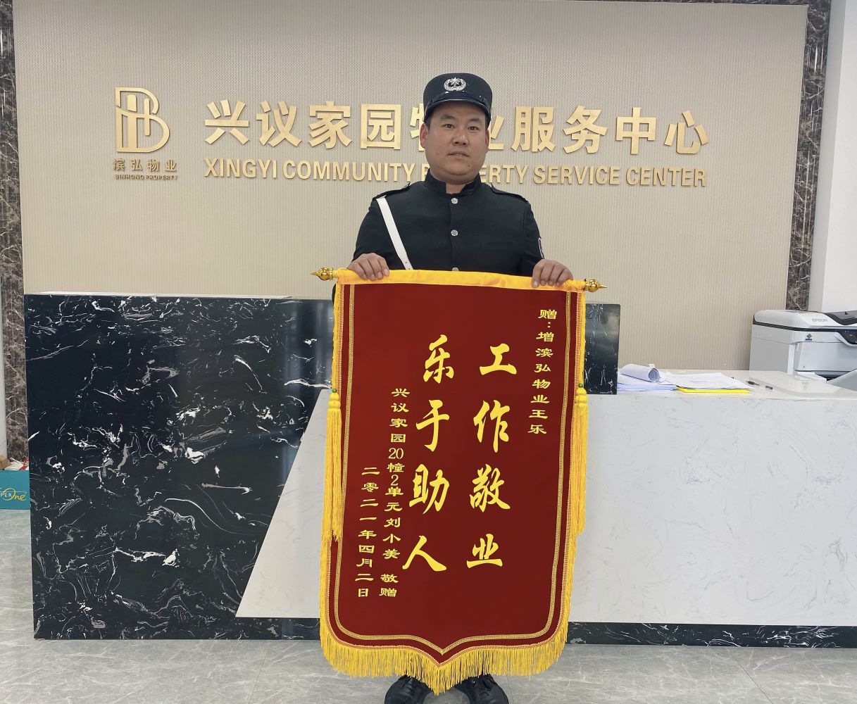 3月29日-30日是興議家園交房的日子。剛拿到新房鑰匙的業(yè)主劉女士懷著喜悅的心情搬家,正搬著氣喘吁吁的時候,被正在巡查的秩序員王樂看到了,他主動上前幫助她,劉女士對秩序員的行為非常贊賞和感激,并在次日送來了錦旗對秩序員王樂表示感謝。