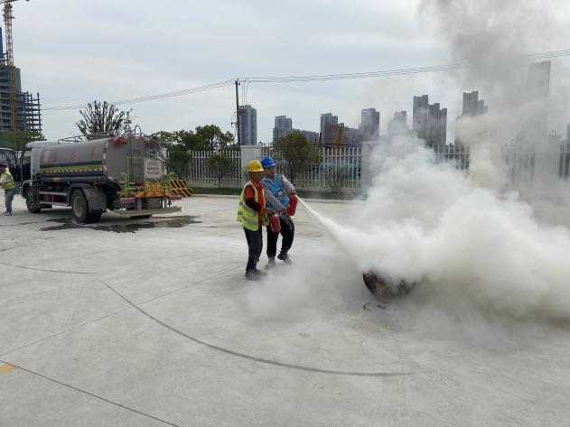 演練活動模擬項目部發生火災的情形,當施工現場突發“火情”,項目安全員在發現后立即大聲喊“生活區宿舍著火了,快來救火”,馬上啟動消防應急預案。聽到安全員救火信號的義務消防隊員及附近的工友迅速拿起放在消防臺上的滅火器趕到事故現場撲救,隨后灑水車也趕來進行救火。在眾人合力撲救下,火勢迅速被撲滅。整個撲救過程處置得當、井然有序,演練現場感強烈。