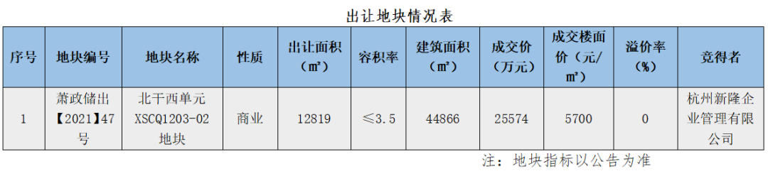 該地塊位于蕭山區(qū)北干街道,東至蕭郵路、南至建設(shè)二路、西至風(fēng)情大道防護(hù)綠地、北至興九路,規(guī)劃性質(zhì)為商業(yè)、商務(wù)用地,掛牌起始價(jià)為25574萬元。經(jīng)過1輪競(jìng)價(jià),杭州新隆企業(yè)管理有限公司以25574萬元總價(jià)競(jìng)得,樓面價(jià)5700元/平方米,溢價(jià)率0%。