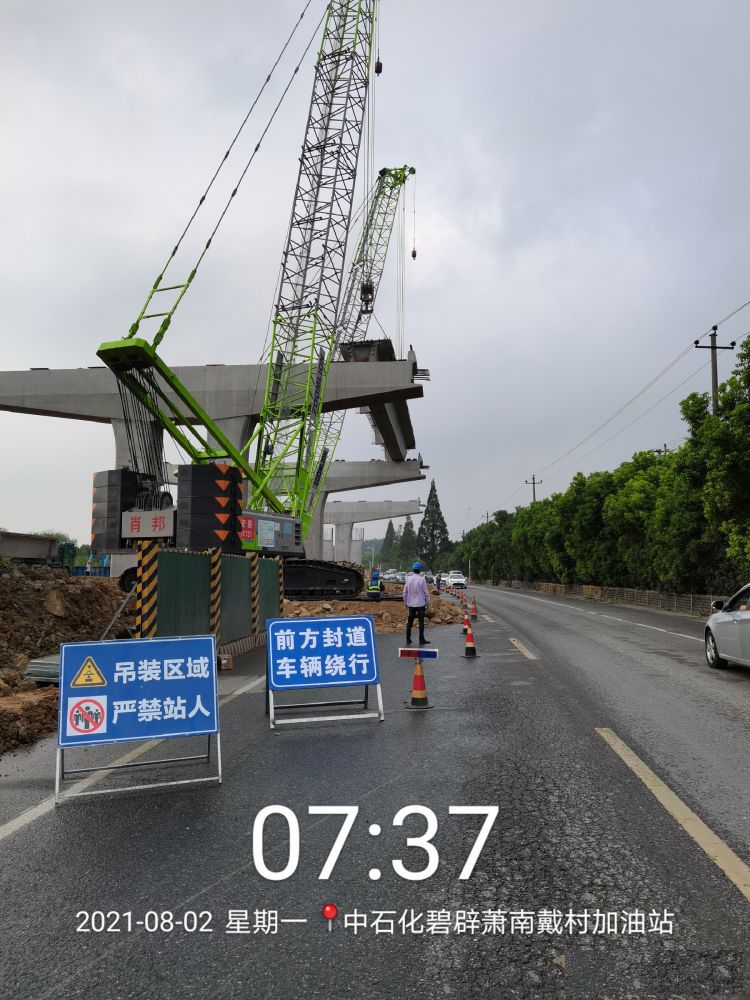 在小箱梁吊裝前,對技術人員和班組進行了分級交底。已對小箱梁的運輸路線全線摸排并進行試運,確保按時到達架梁場地。對施工地點周邊的社會通行車輛的流量進行了監控,選擇車流量最小的合理時間進行架設,對沿線居民發布了施工公告。采用兩臺200T履帶吊進行架設,相比于汽車吊,更加安全高效。吊裝前,對履帶吊的工作面進行了模擬。對臨時占用的車道進行了審批,設置了警示標志,專職安全員全程旁站,監督檢查吊裝和交通安全,安排專人對通行車輛進行指揮。