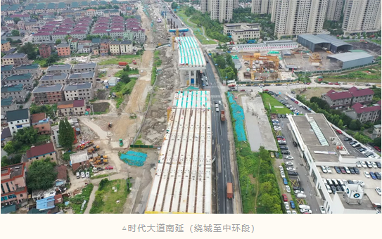 時代大道南延高架橋上下部結(jié)構(gòu)有序推進。