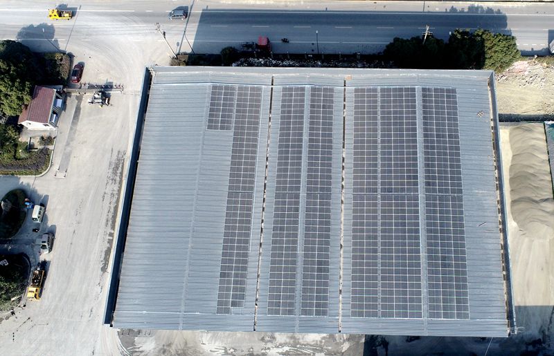 路橋工程公司與浙江中新電力工程建設(shè)有限公司合作,在路橋工程公司瀝青混凝土拌和中心新建堆料倉屋頂上(面積為3150㎡)安裝光伏發(fā)電系統(tǒng)。投入使用后,拌和中心光伏電站年均發(fā)電量約28萬度,將為瀝青拌和中心生產(chǎn)節(jié)省很大一部分電費支出。同時,也為建立一家“低碳瀝青拌和中心”甚至“零碳瀝青拌和中心”打下堅實基礎(chǔ),逐步實現(xiàn)生產(chǎn)基地“綠色能源”的自給自足。