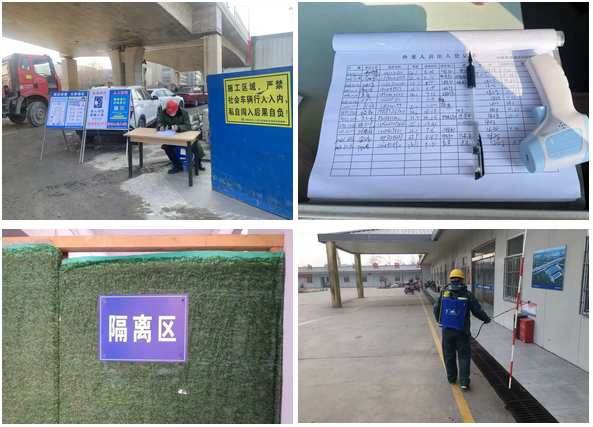 在建工地:項目出入口實行封閉化管理,進門需亮碼、測溫、登記,無關人員嚴禁入內;對項目部及生活區每天進行消毒清潔;設置隔離區。