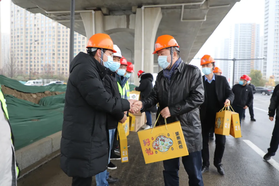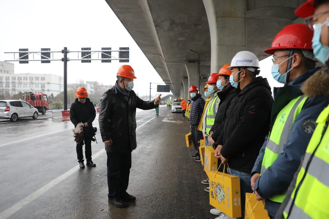 方軍一行先后來到03省道東復線高架南延工程戚楓路口和北塘河橋施工路段,查看了工程部分關鍵節點進展和沿線附屬工程設施建設情況,詳細了解了工程后續進度節點計劃和現階段具體施工、隱患排查、應急處置等方面的安全生產舉措落實情況,并為現場施工人員送去節日的問候和祝福,對他們的辛勤付出表示感謝。
