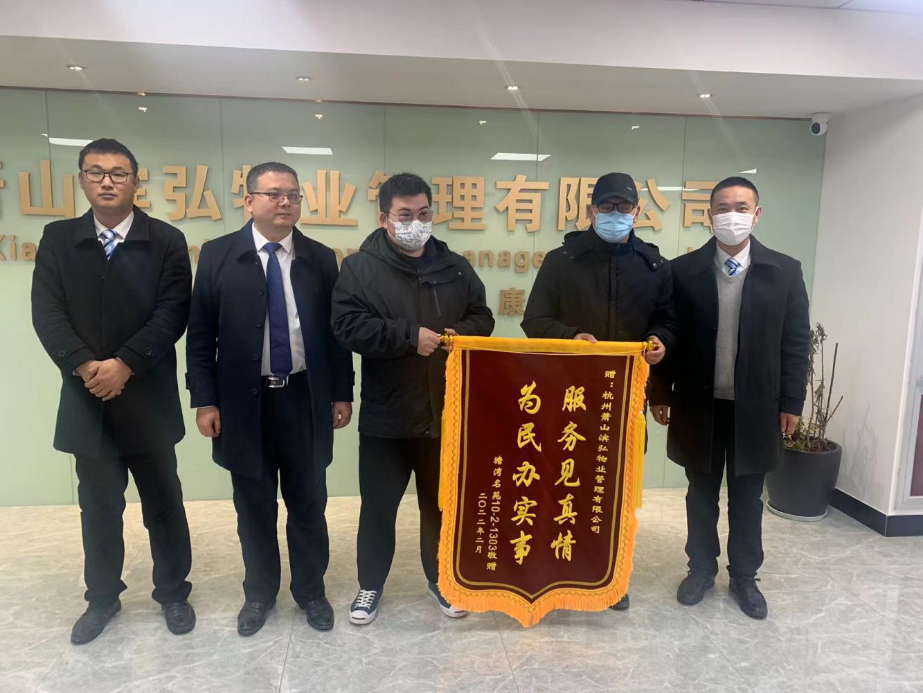 2月8日中午,塘灣名苑小區(qū)2位17棟熱心業(yè)主前往公司,為小區(qū)物業(yè)送去一面寫有“為民辦實事,服務(wù)見真情”的錦旗。對在疫情期間沖鋒在前、堅守一線的濱弘物業(yè)全體工作人員表示感謝!