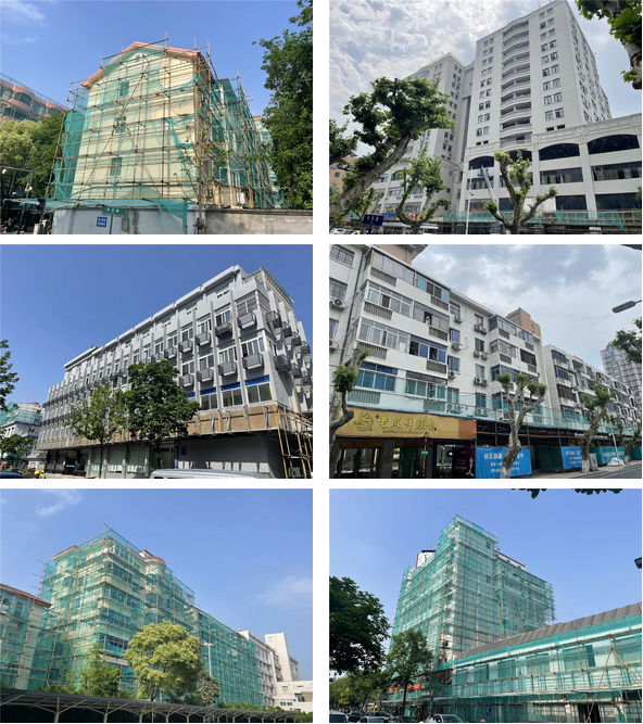 當前進度:總體完成70%,其中外架搭設完成100%,外墻面部分整治拆除95%,涂料完成70%,屋面檢修防水完成30%,店招龍骨安裝完成90%。