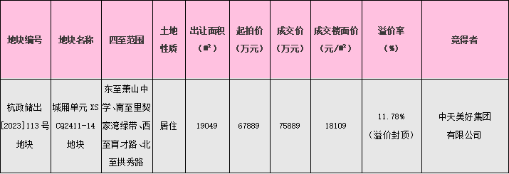 今日,在杭州市規(guī)劃和自然資源局蕭山分局、蕭山區(qū)住房和城鄉(xiāng)建設(shè)局、城廂街道等相關(guān)單位的鼎力支持下,由交投集團作為做地主體的城廂單元XSCQ2411-14地塊(杭政儲出[2023]114號地塊)未開拍已封頂,經(jīng)過16輪報價,在掛牌期間就達到上限價格75889萬元,樓面價18109元/㎡,溢價率11.78%。線下?lián)u號環(huán)節(jié),共有25家房企參與搖號,最終由中天美好集團有限公司搖號競得該地塊!
