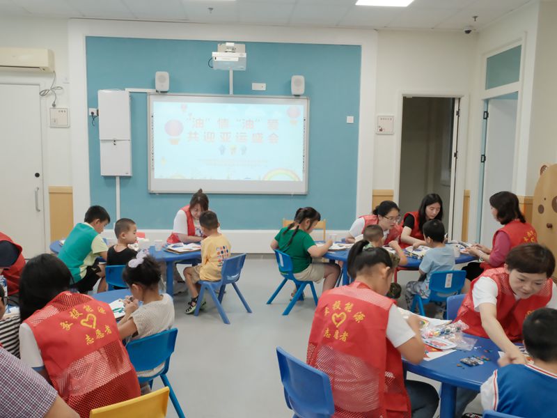 現場,小朋友們很快便熟絡起來,在中心老師及活動人員的指導和幫助下,饒有興致地投入到印有亞運元素的帆布包涂鴉制作過程中。從顏料調色、給帆布包上的亞運吉祥物上色、亦或自由發揮想象去作畫,大人們和小孩們,大手攜小手,互相配合默契,活動現場充滿了歡聲笑語,讓“星星的孩子”感受到陪伴的快樂,不再孤單。