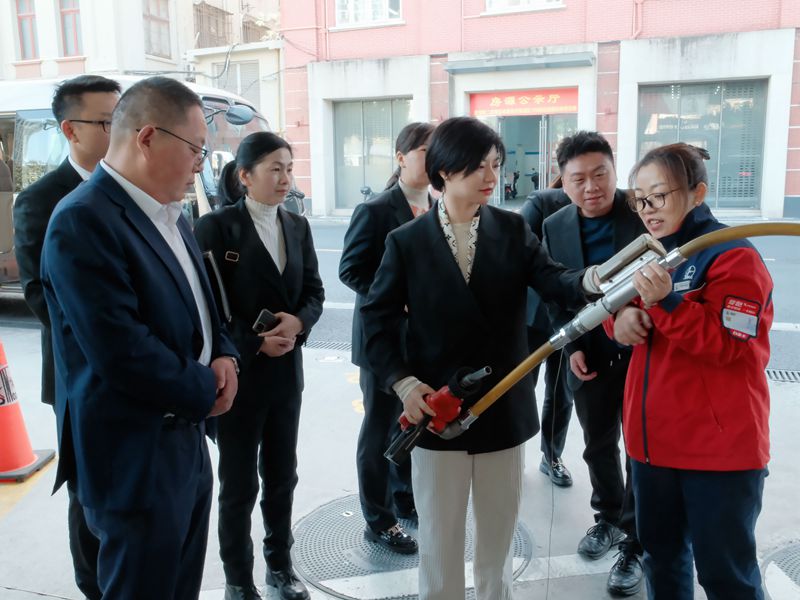 考察第一站來到浙江嘉興平湖濱海大道站,該站是中國石化首座批零兼營“五位一體”綜合能源服務站,除加油、加氣、充電和易捷服務外,該站還以零售和批發兩種形式提供氫氣業務,中石化平湖支公司經理朱寅及片區經理邵佳熱情接待了公司考察團一行。