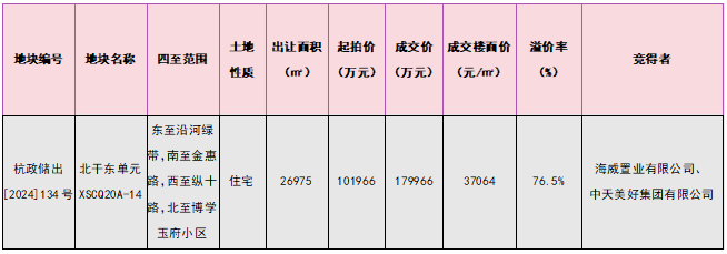 該地塊東至沿河綠帶,南至金惠路,西至縱十路,北至博學玉府小區(qū),出讓面積26975平方米(40.4625畝),1.0≤容積率≤1.8。地塊起始價101966萬元,開拍僅30分鐘,溢價率上升至55%。經過70輪競價,最終由海威置業(yè)有限公司、中天美好集團有限公司以179966萬元總價競得,成交樓面價37064元/㎡,溢價率76.5%(溢價率不僅為今年最高,更創(chuàng)杭州市區(qū)7年來溢價率新高)。