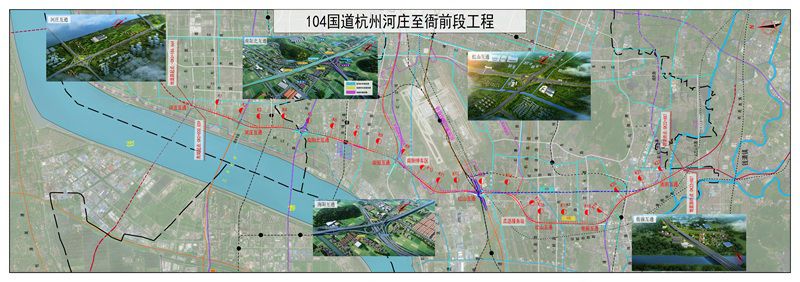 104國道杭州河莊至衙前段工程主線起點位于杭州錢塘區河莊街道,規劃濱江二路與江東三路交叉處,路線向南延伸,經南陽街道、紅山農場、瓜瀝鎮,終于杭州紹興交界處衙前鎮,與104國道紹興段順接,路線全長約22.8公里(其中蕭山段長約18.1公里)。工程按一級公路標準設計建設,采用“高架橋結合地面道路”形式,高架橋設計速度80公里/小時,地面道路設計速度60公里/小時。目前,一階段工程已完成總進度的35%。