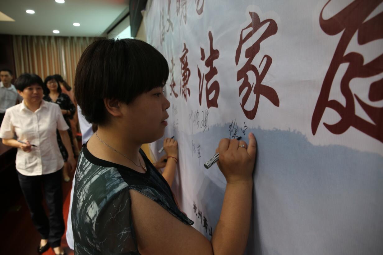會議對本次“倡文明家風·建廉潔家庭”活動進行了介紹和動員,向干部家屬發放了“廉政賬本”和《顏氏家訓》書本,并組織干部家屬在“倡文明家風·建廉潔家庭”承諾板上簽名。家屬代表圍繞如何建設文明廉潔家風,幫助家人遠離誘惑、杜絕腐敗,筑起家庭反腐倡廉的堡壘作了發言。