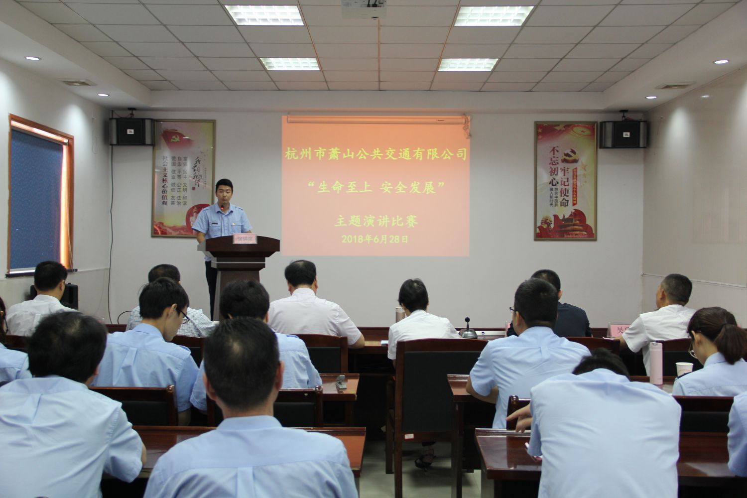 為認真開展“安全生產月”活動,積極營造安全生產良好氛圍,6月28日上午,蕭山公交舉辦了“生命至上、安全發展”主題演講比賽,經過前期預賽,8個分工會的10名選手參加了決賽。區運管處安全科科長茹炳洪、交通治安派出所羅德剛指導員、集團工會副主席來宗德、公司王黎洪、吳勇義、韓興良、徐燕等班子領導蒞臨指導。