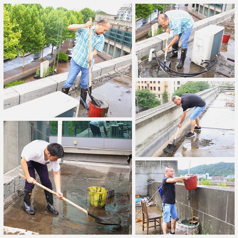 公司總經理王建維在檢查中發現公司樓頂露臺存在排水不暢,極易造成積水及漏水的安全隱患,立即要求公司相關部門組織人員做好管道淤泥清理工作,減少臺風暴雨帶來的滲漏風險。