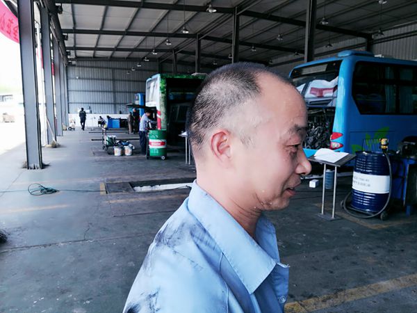 正值中午,烈日當頭,地溝上,修理工老閆滿臉是汗,手拿著工具,剛打開公交車后艙門,頓時一股熱浪襲來,發動機附近的溫度遠比外面的氣溫來得高,即使站在幾米遠的地方,那陣陣熱浪也能讓你揮汗如雨,而師傅們卻沒有退縮,以高度的責任依然堅守在崗位上。