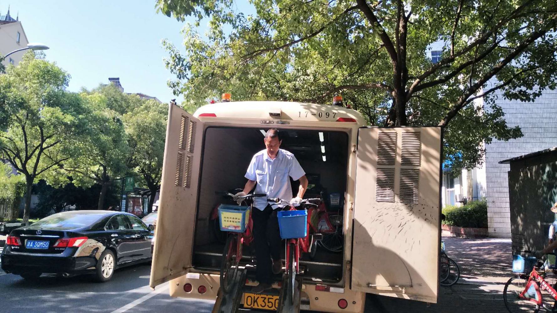 公共自行車值守人員李國平,每天在體育館南服務點頂著烈日高溫,檢查、擺放站點車輛。僅在早晚高峰時段,上樁下樁車輛就達兩百多車次。衣服被汗水浸濕了又干,干了又濕。調度車駕駛員陳炳田和搬運工來可奇、王國榮,每天運送公共自行車兩百多輛。自行車站點上熱浪襲人,剛剛裝、卸幾輛自行車的他就已大汗淋漓,臉上掛滿汗珠。汗水流進了眼睛,汗水沁透了衣衫。才稍微干了點兒的衣服立即又濕了一大片。自行車維修工董浩成,每天拿到任務單后,便開始了一天的檢修工作,為自行車挨個“體檢”,每天工作近10小時,從早上上班開始,雙手就因為修車沾滿了油污和泥土,他們嫻熟的動作、十足的干勁、揮灑的汗水……不由地令人心生敬意。