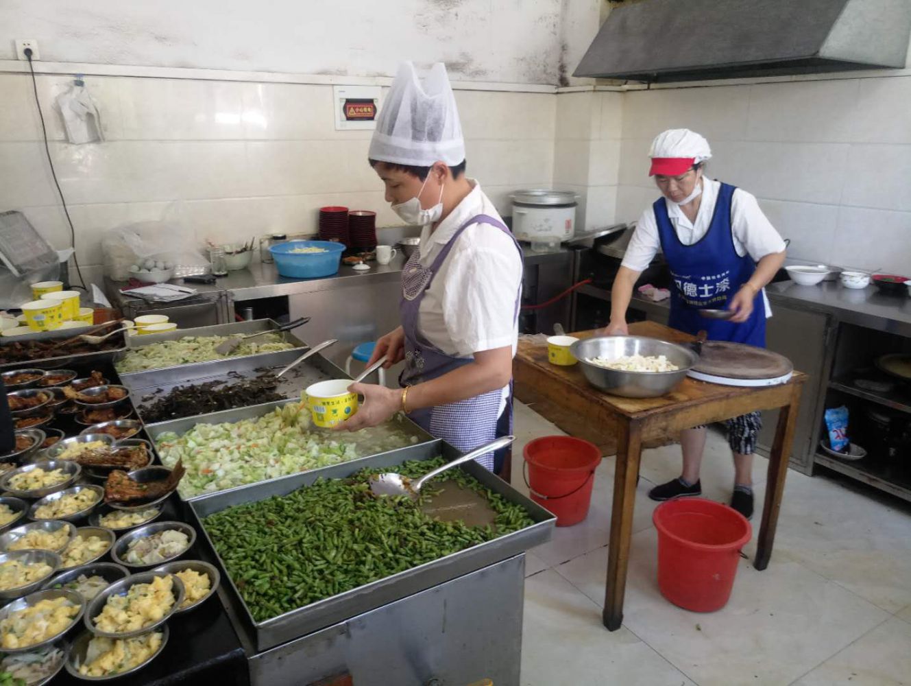 興沖沖去打飯,廚房操作間里還在乒乒乓乓,大鍋里翻炒著什么我看不清。就看到帶著袖筒的大姐拿著兩個(gè)鍋鏟左右開工。爐灶的火光隱約可見,打飯窗口熱氣鋪面。抬頭看見一雙微笑的眼睛,打菜的大姐穿著完整的廚房工作服正在等我點(diǎn)餐。額間的汗水打濕了帽檐,圍裙綁帶處早就汗?jié)瘛R驗(yàn)橄氲揭獙懲ㄓ嵏澹蛩悴杉c(diǎn)素材,對著大姐拍照,她搖手拒絕了。也許我該出其不意的拍下敬業(yè)的畫面。
