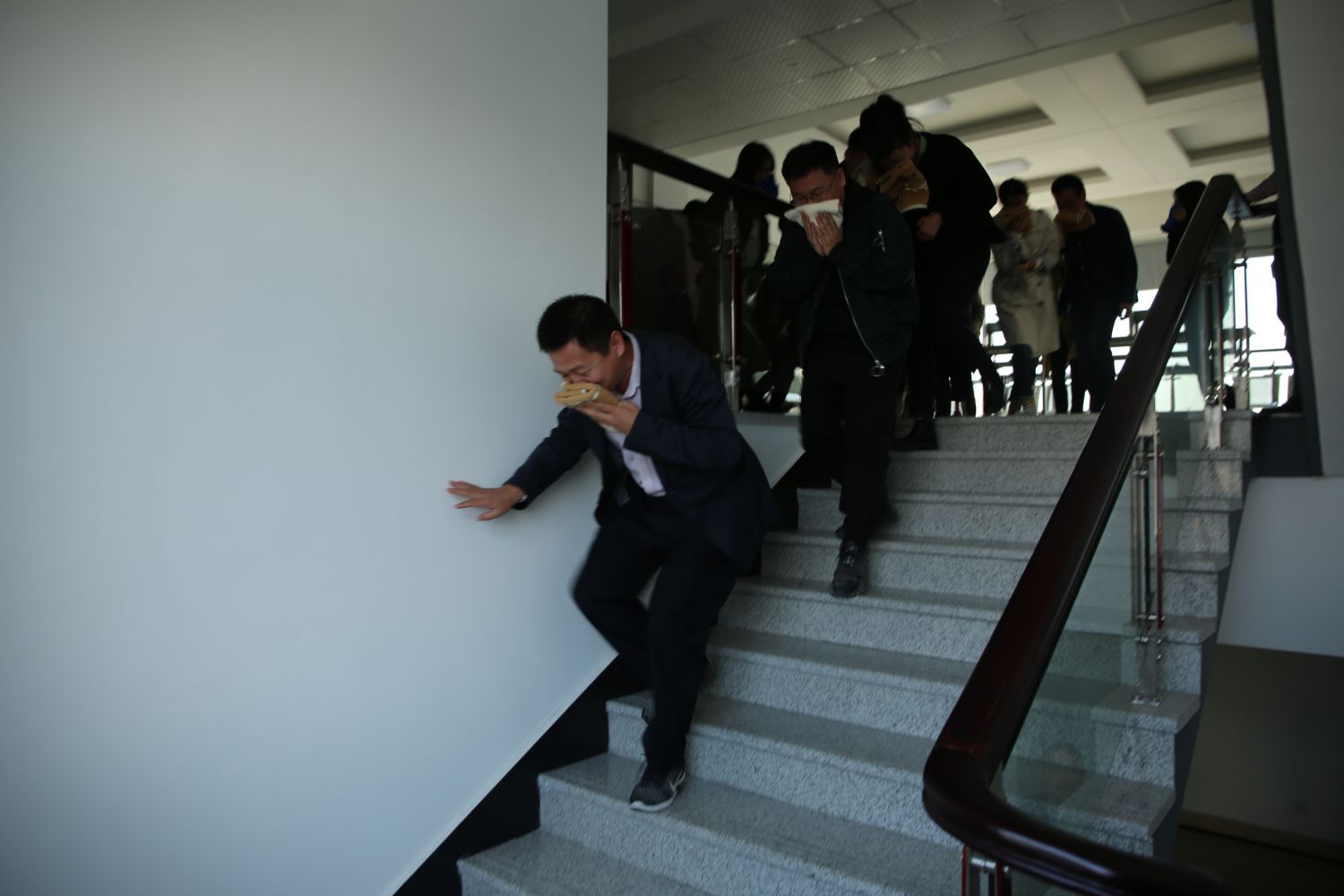 15時37分,培訓現場模擬火情發生,現場指揮人員發出疏散指令。安全員吹響哨子、手持小紅旗在前引路,參與演練人員用濕毛巾捂住口鼻,依次順著疏散樓梯右側向下撤離至大樓室外廣場。整個撤離過程緊張、安全、有序,從發出疏散指令到人員全部撤離至大樓室外廣場,用時2分05秒。