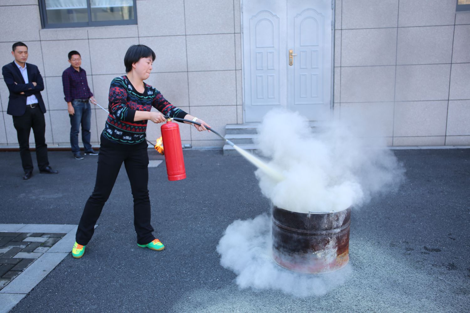 隨后,由安全員講解滅火器使用方法及注意事項,講解完畢后,參與人員進行實際滅火操作。