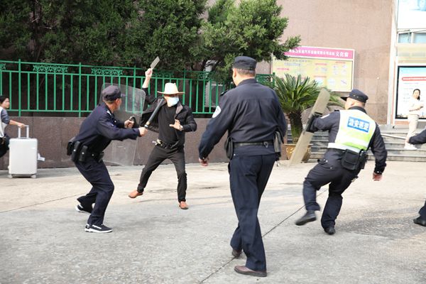 演練中,公司安保人員在前廣場巡查時,發(fā)現(xiàn)一名可疑男子手持刀具,安保人員胡師傅立即上前詢問,該男子突然提刀砍向了胡師傅。胡師傅當(dāng)機立斷拿出防暴工具與該男子糾纏,同時使用對講機向保安隊長和物業(yè)部經(jīng)理聯(lián)系要求立即增援,并撥打110疏散群眾。物業(yè)部經(jīng)理接到電話后,立即向安保部經(jīng)理和駐站分管民警匯報,同時啟動反恐應(yīng)急預(yù)案,組織人員趕往現(xiàn)場,三分鐘后警務(wù)人員趕到現(xiàn)場聯(lián)同安保人員將該男子制服。