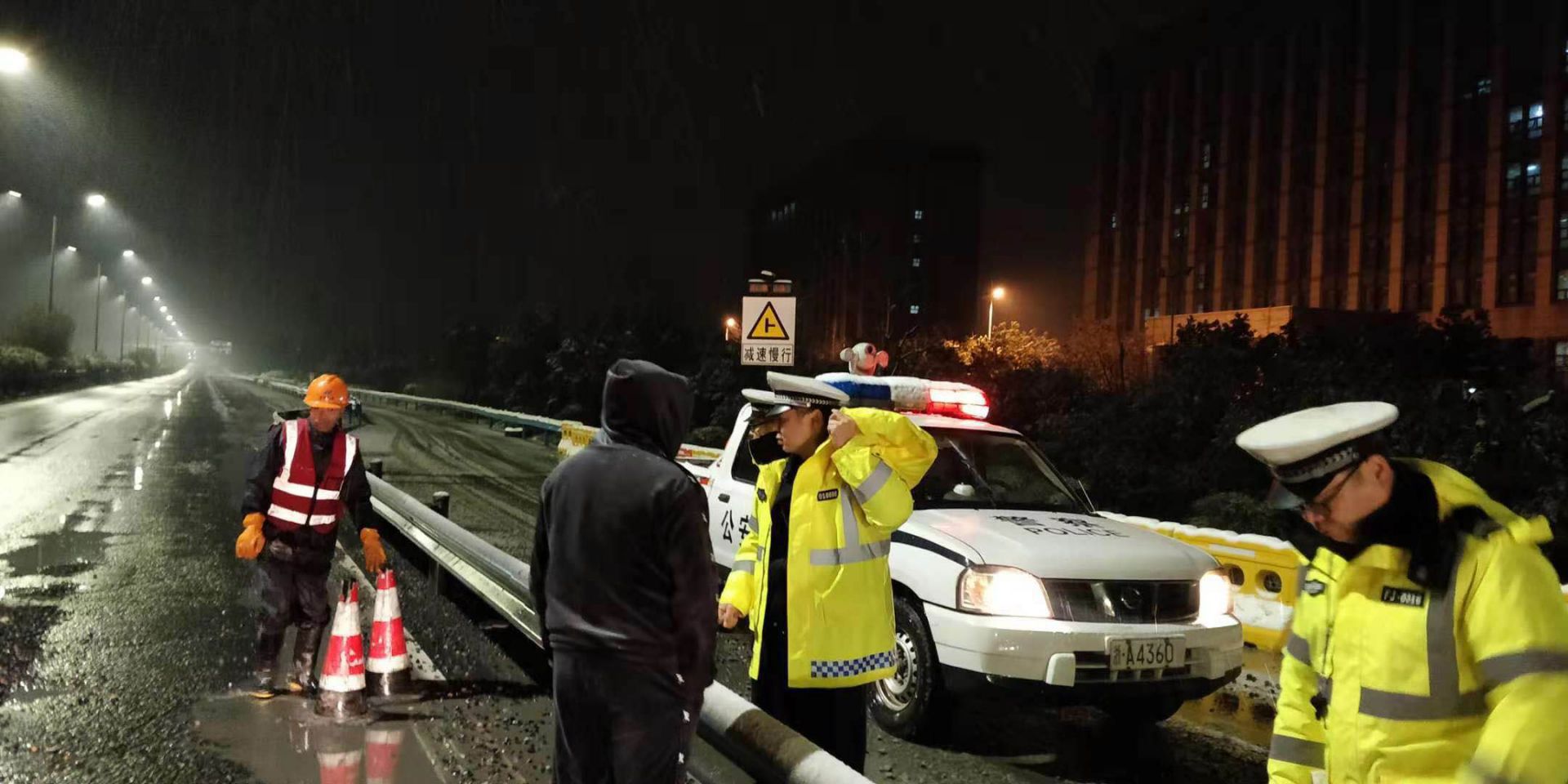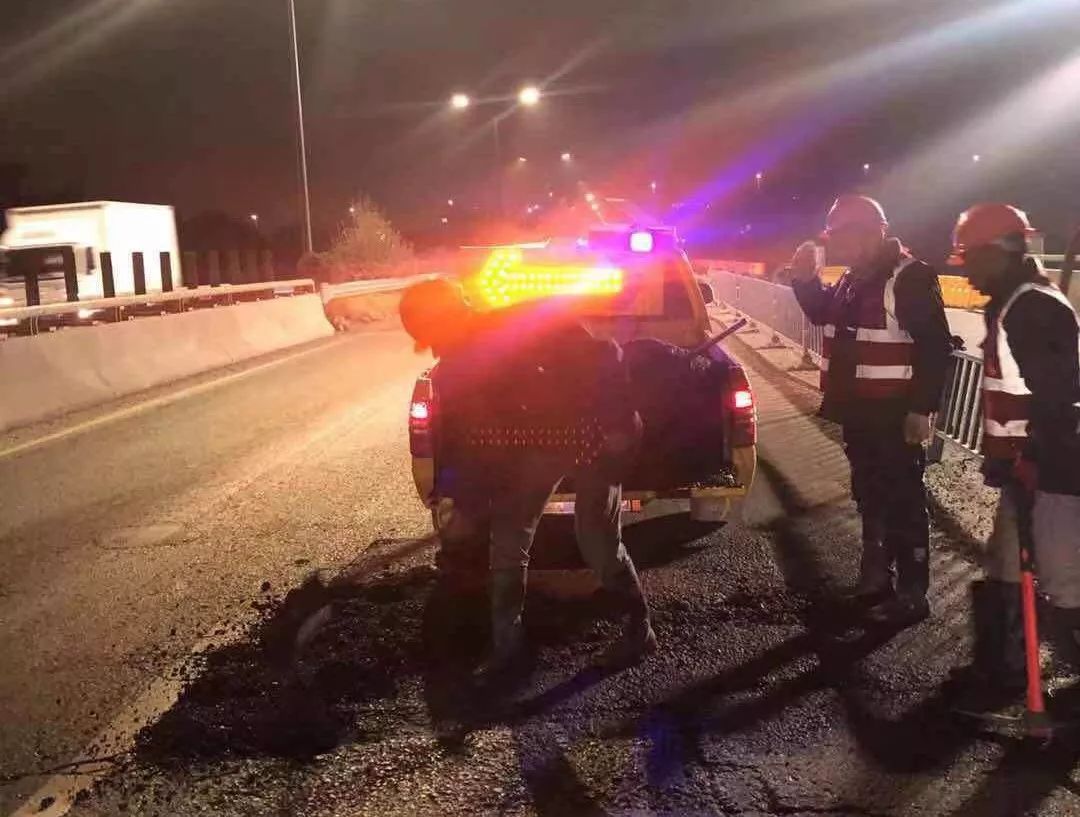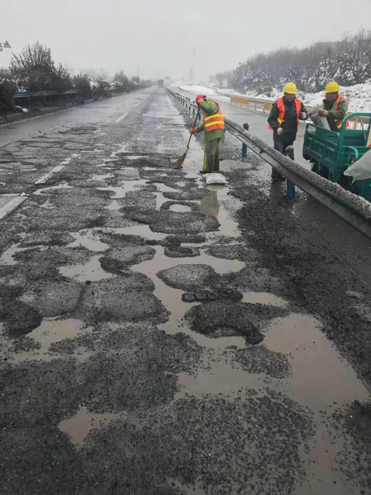 9日大雪,集團(tuán)各部門(mén)第一時(shí)間啟動(dòng)雨雪天氣應(yīng)急預(yù)案,增加了應(yīng)急保障力量,進(jìn)行24小時(shí)巡查,對(duì)路面坑洞進(jìn)行修補(bǔ)及除雪除冰。考慮到天氣、重荷載車(chē)輛多等因素,采用了水泥穩(wěn)定碎石混合料、瀝青冷料等進(jìn)行臨時(shí)修補(bǔ),同時(shí)增設(shè)警示標(biāo)志,確保道路正常有序通行。期間,共投入物資有工業(yè)鹽16噸、草袋1500個(gè)、瀝青混凝土冷料26噸、水泥穩(wěn)定碎石干拌料50噸、快干水泥8噸、錐形帽500個(gè)、警示燈230個(gè);投入安全巡邏車(chē)、鏟車(chē)、挖機(jī)、運(yùn)輸車(chē)輛等機(jī)械設(shè)備共17臺(tái)(套);