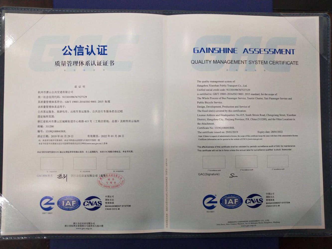 2019年1月29日,浙江公信認證有限公司向蕭山公交公司頒發《質量管理體系認證證書 》,這標志著我司的公共客運服務、旅游包車、出租客運服務、公共自行車服務的全過程質量管理體系符合GB/T19001-2016/ISO 9001:2015標準。此證書同時證實了我司不僅有能力提供滿足廣大乘客需求的優質服務,而且服務質量已經達到了國際認可的標準,這對于企業實施品牌戰略、實現企業長遠、可持續發展具有十分重要的現實意義。