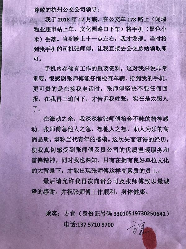 方先生說:當天拿回手機后就忙于工作,把這件事情忘記了,剛好近日坐車又碰到了張仁亮師傅,才讓他突然又想起來去年拾金不昧的事跡,連忙寫了一封感謝信交給了車隊,特地來感謝張師傅及公交公司的優質溫暖服務和雷鋒精神。同時,方先生也感慨,只有在擁有良好企業文化的大背景下,才能培養出張師傅這樣品德高素質高的員工,能夠受到這樣公司的服務,是老百姓的福氣。