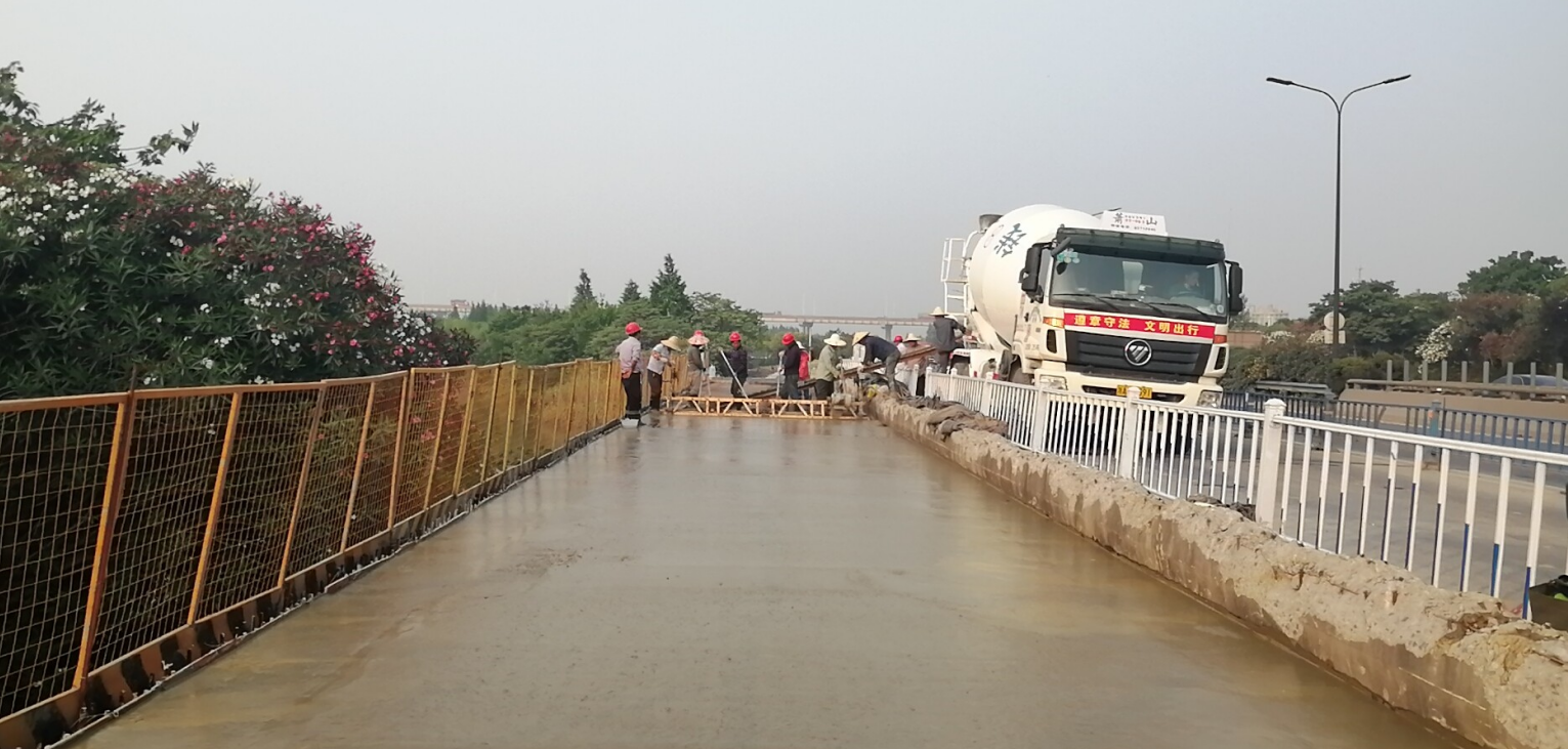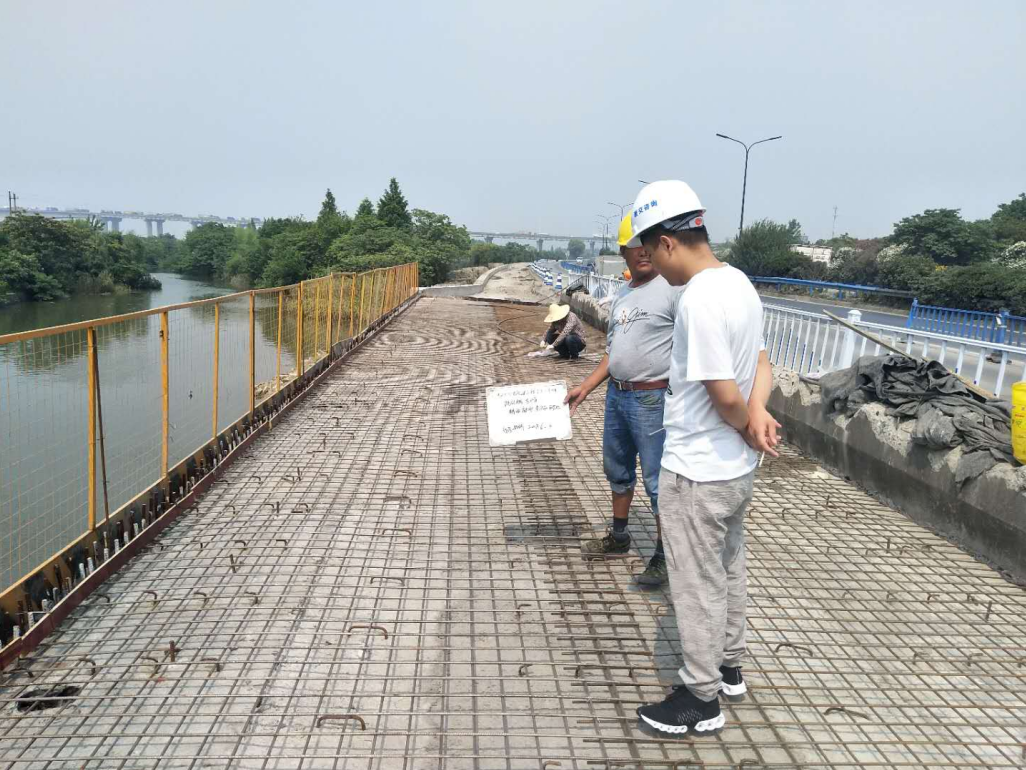 K1+322現(xiàn)代橋?yàn)閮蓚?cè)拼寬結(jié)構(gòu),拼寬寬度2*5m,全橋共3跨,全長(zhǎng)51.04米。由于是拼寬路段,該橋在施工過(guò)程中為保證邊通車邊施工的安全,同時(shí)也為保質(zhì)保量的完成橋面系混凝土的順利澆筑,項(xiàng)目部領(lǐng)導(dǎo)和技術(shù)員在澆筑前對(duì)現(xiàn)場(chǎng)作業(yè)人員進(jìn)行了詳細(xì)的施工技術(shù)及安全交底。現(xiàn)場(chǎng)施工過(guò)程中,技術(shù)人員認(rèn)真核對(duì)設(shè)計(jì)圖紙,嚴(yán)格做好抓安全、保質(zhì)量工作,對(duì)每道工序施工質(zhì)量和報(bào)驗(yàn)程序進(jìn)行嚴(yán)格把關(guān),保證各道工序?qū)訉勇鋵?shí)到位;強(qiáng)化過(guò)程管控,對(duì)施工各環(huán)節(jié)進(jìn)行監(jiān)控,監(jiān)理組全過(guò)程進(jìn)行旁站,確保了橋面鋪裝一次澆筑完成。